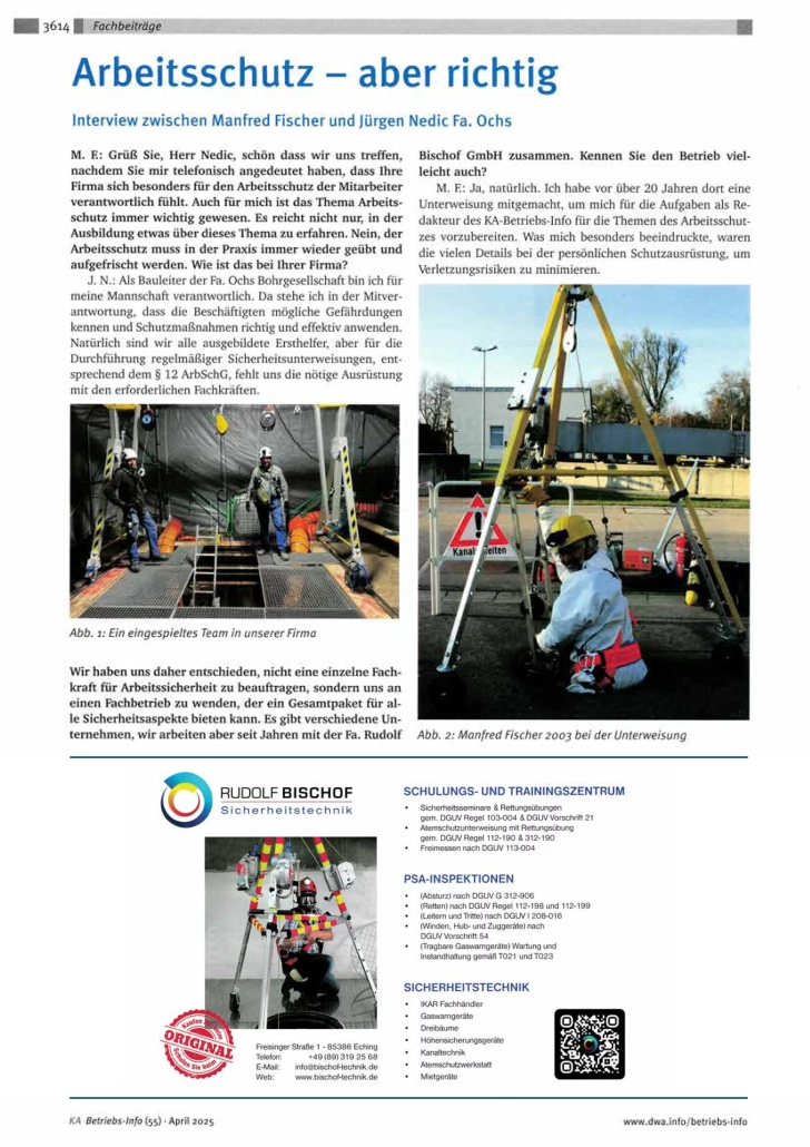 Bischof Sicherheitstechnik (Spezialgebiet Ver- und Entsorger): Alles für die Arbeitssicherheit im Wasser- und Abwasserbereich, Gaswarngeräte, Atemschutzausrüstung, Rettungsgeräte, PSA, Dreibäume, Schachteinstiegshilfen, Abdeckroste, Kragarmgalgen, Mobilkräne, Fahrzeug-Ladekran mit Personensicherung und feste Anschlagpunkte mit Absturzsicherungs- und Rettungsgeräte. Wartung und Service für Persönliche Schutzausrüstungen, Gaswarngeräte und Hebezeuge.